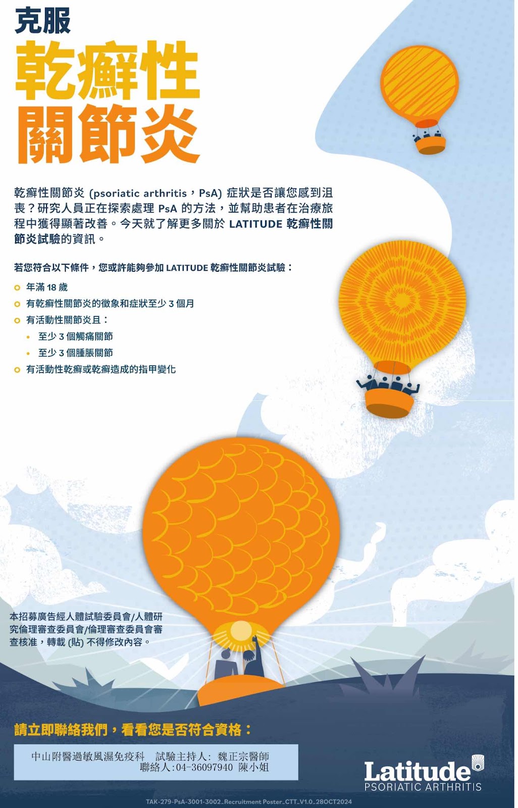 這是我們正在進行中的臨床試驗招募廣告,已經經過人體實驗委員會IRB核可, IRB同意我們可以進行實體海報跟電子媒體的招募😊詳情請參閱台灣臨床試驗網: https://e-sub.fda.gov.tw/ClinicalTrialInfo/case-search/TAK-279-PsA-3001