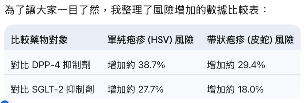 這項研究利用 TriNetX 美國電子健康紀錄網絡,分析了數萬名糖尿病患者的數據。研究結果顯示,與使用其他常見糖尿病藥物(如 DPP-4 抑制劑或 SGLT-2 抑制劑)的患者相比,使用 GLP-1 藥物的患者發生**單純疱疹(HSV)和帶狀疱疹(HZ,俗稱皮蛇)**的風險顯著較高。