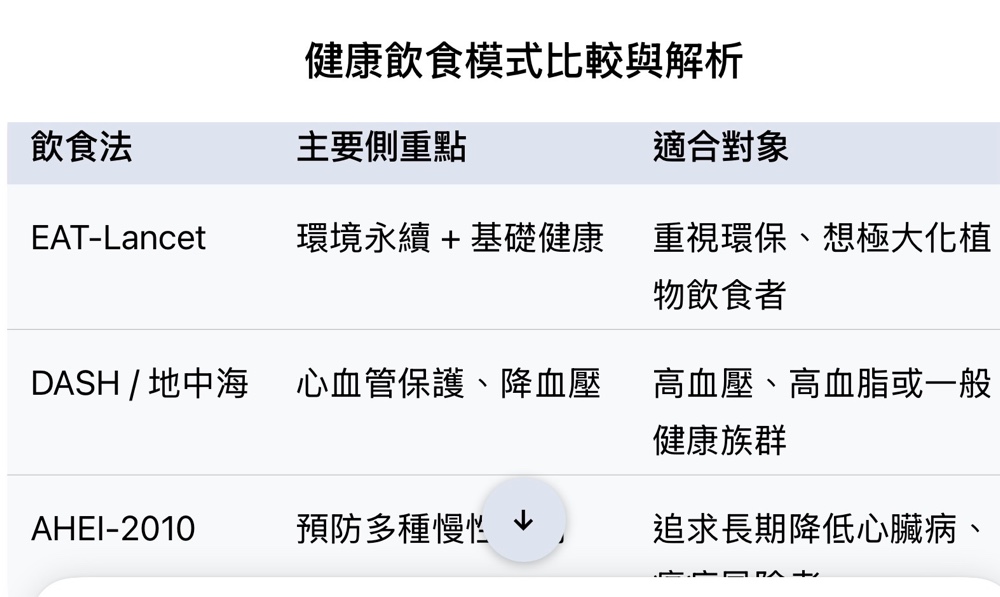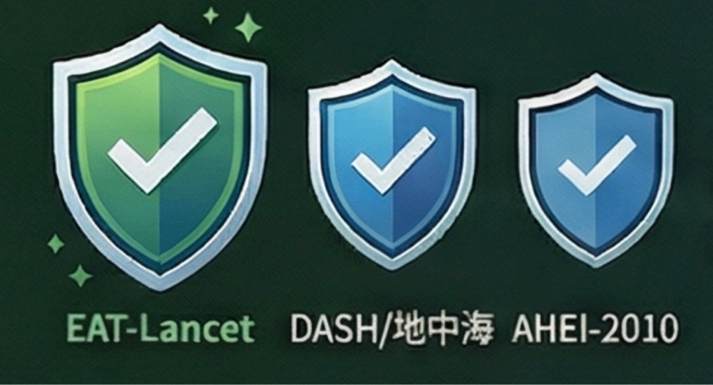 • 重點指標: 包含大量攝取全穀類、堅果與豆類、Omega-3 脂肪酸,並限制含糖飲料與果汁。