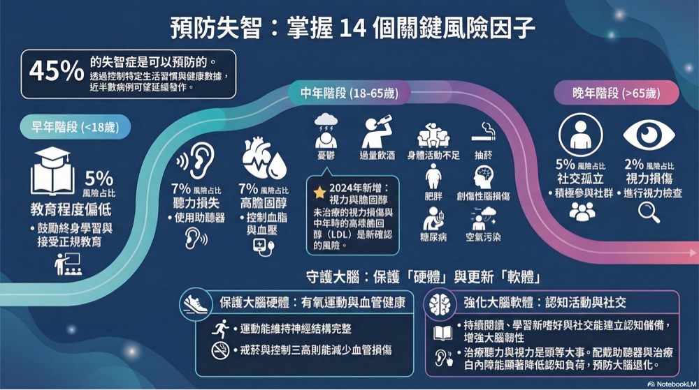 根據《刺胳針》(The Lancet) 2024 年發布的研究,全球約有 45% 的失智症病例是可以透過改變生活習慣來「預防」或「延緩」的!