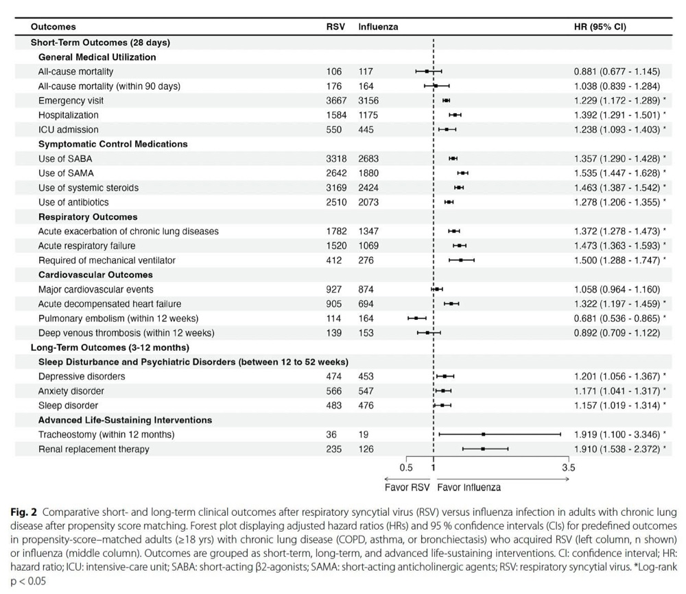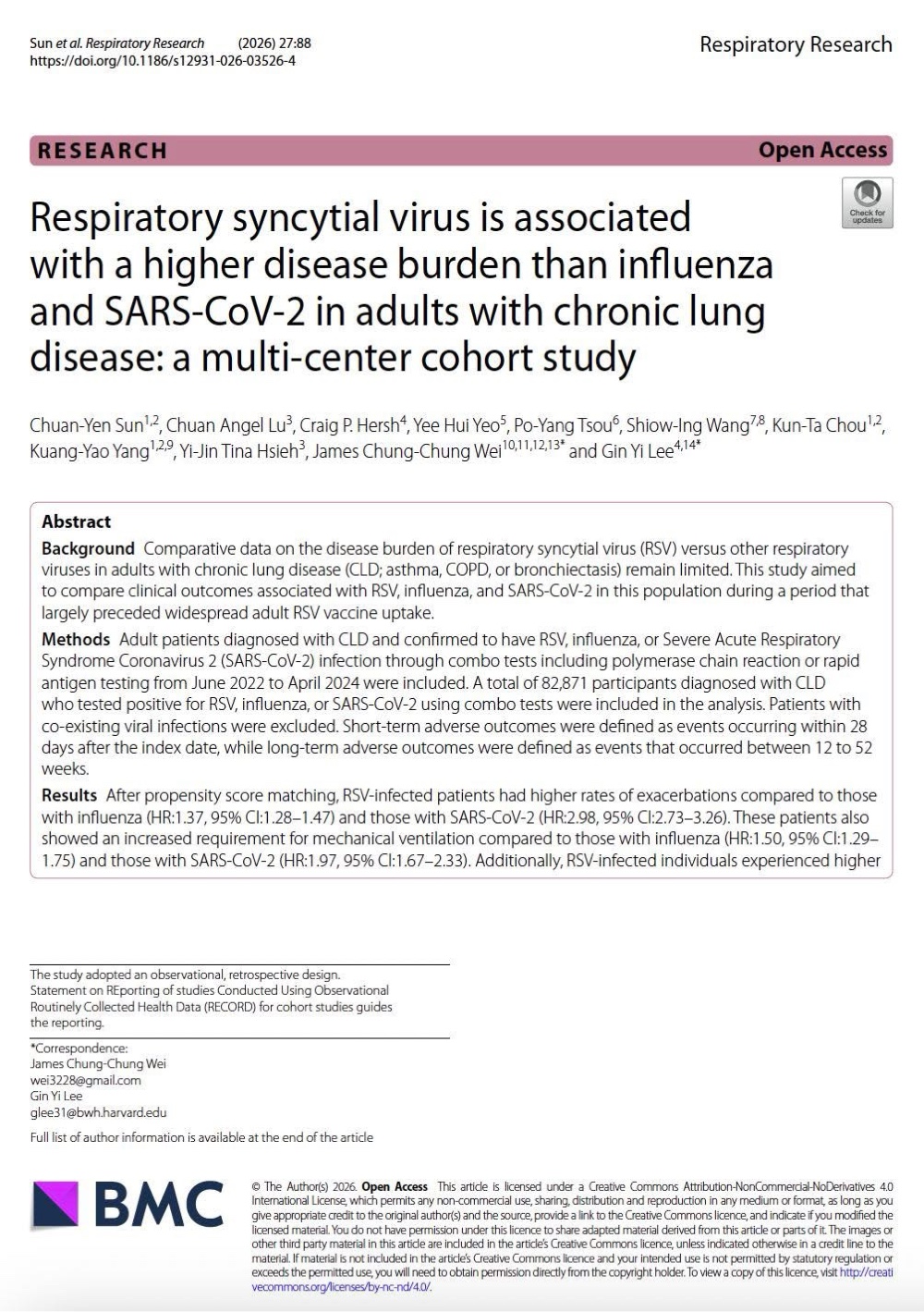 分享我們團隊最新的研究論文 。這項研究指出,對於慢性肺病患者而言,呼吸道融合(RSV) 病毒帶來的威脅甚至高於流感與新冠病毒 。