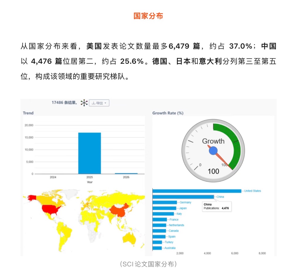 從國家分布來看,美國發表論文數量最多6,479 篇,約佔 37.0%;中國以 4,476 篇位居第二,約佔 25.6%。德國、日本和意大利分列第三至第五位,構成該領域的重要研究梯隊。